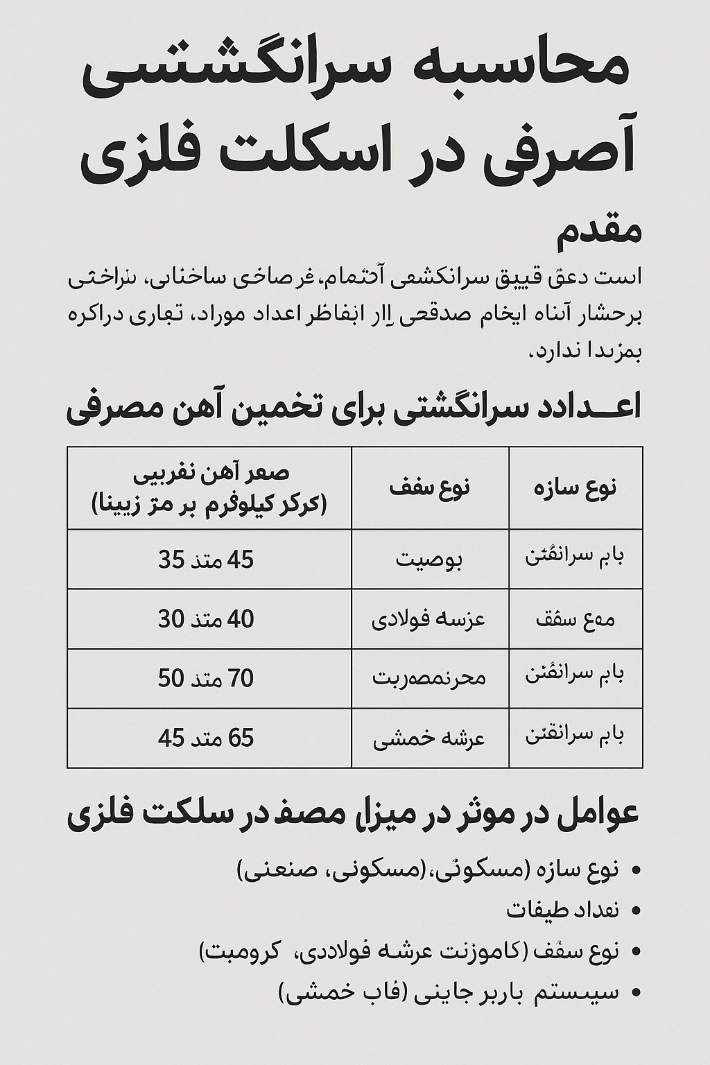 محاسبه سرانگشتی آهن مصرفی در اسکلت فلزی مقدمه محاسبه دقیق و سریع میزان آهنآلات مصرفی در پروژههای ساختمانی یکی از دغدغه . . .